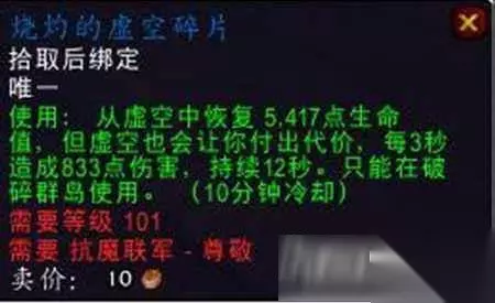 尊敬: 烧灼的虚空碎片:110级时恢复52万血,每3秒承受8万点伤害,1000虚空碎片。