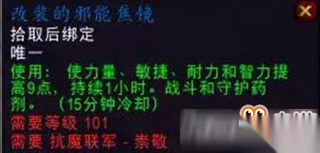 邪能焦镜:常驻合剂道具,110级全属性提升500点,1500虚空碎片。