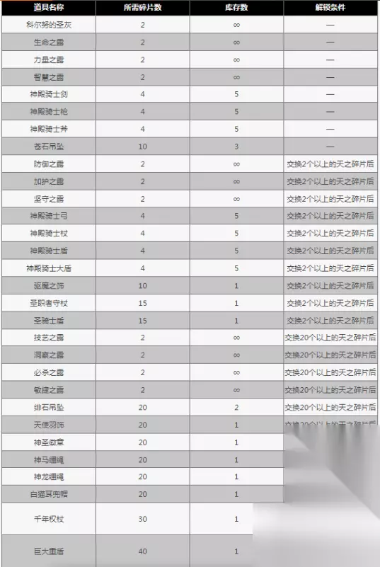 兑换物品表一览: