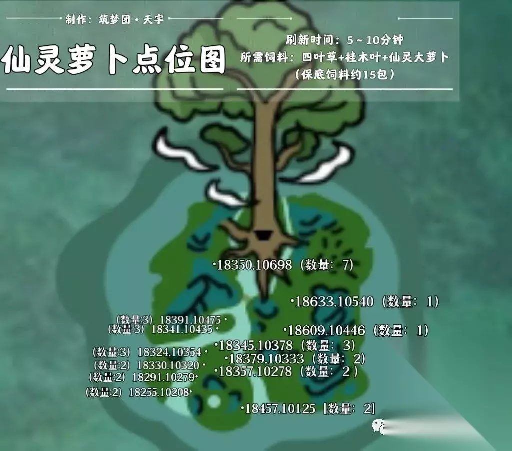仙灵萝卜饲料:四叶草+桂木叶+仙灵大萝卜(15包) 仙草妖饲料:饲料·四叶草+桂木叶+仙灵大萝卜(15包) ⚡四叶草:天空群岛区域的一种特有植物,分布广泛,获取容易。
