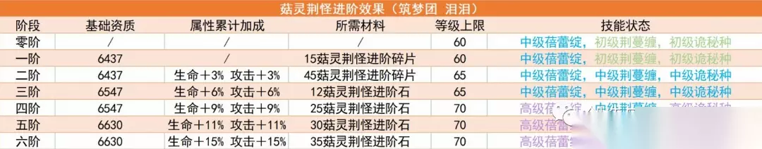 菇灵荆怪分别在2阶,4阶,6阶会有一个明显地提升。2阶三个技能均达到中级,等级上限由60→65级,且只需要便宜的进阶碎片,比较适合平民;而4阶的菇灵荆怪技能、属性都有明显的变化,相当于青春版6阶菇灵荆怪,伤害技能都到达了高级,并且等级上限由65→70级;6阶属性得到更大的提升同时,获得了唯一个终极技能,不过培养费用是4阶的近3倍,看需求进阶