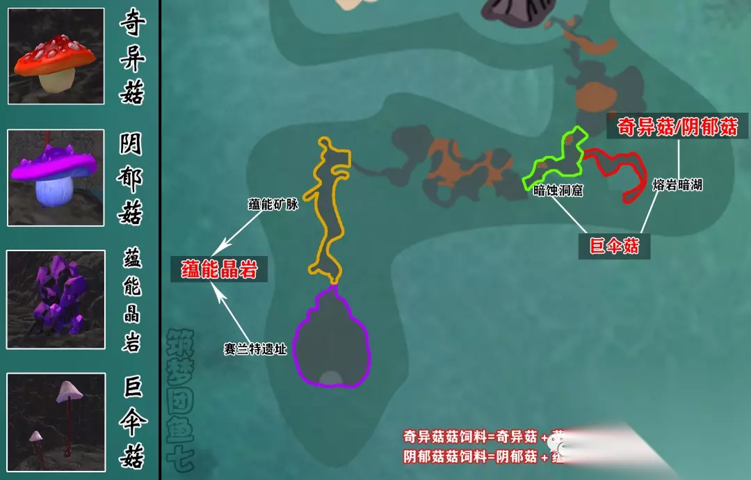 奇异菇菇饲料=奇异菇+蕴能结晶+巨伞菇根茎(35包 阴郁菇菇饲料=阴郁菇+蕴能结晶+巨伞菇伞盖(45包) ⚡奇异菇&阴郁菇:奇异菇外形为红色的大蘑菇,阴郁菇外形为紫色大蘑菇,这两种蘑菇主要分布在熔岩暗湖区域,也可以通过击杀奇异菇菇&阴郁菇菇获得。