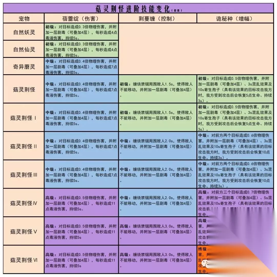下面是菇灵荆怪的技能进阶变化详情图