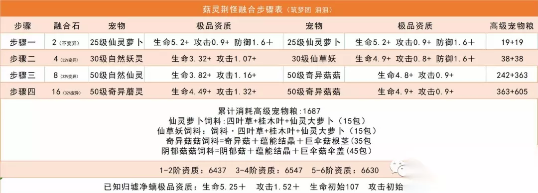 算下来每融合一只菇灵荆怪需要1687包高级宠物粮,相比于其他融合宠物要的经验要低得多的。菇灵荆怪合成表给大家看一看: