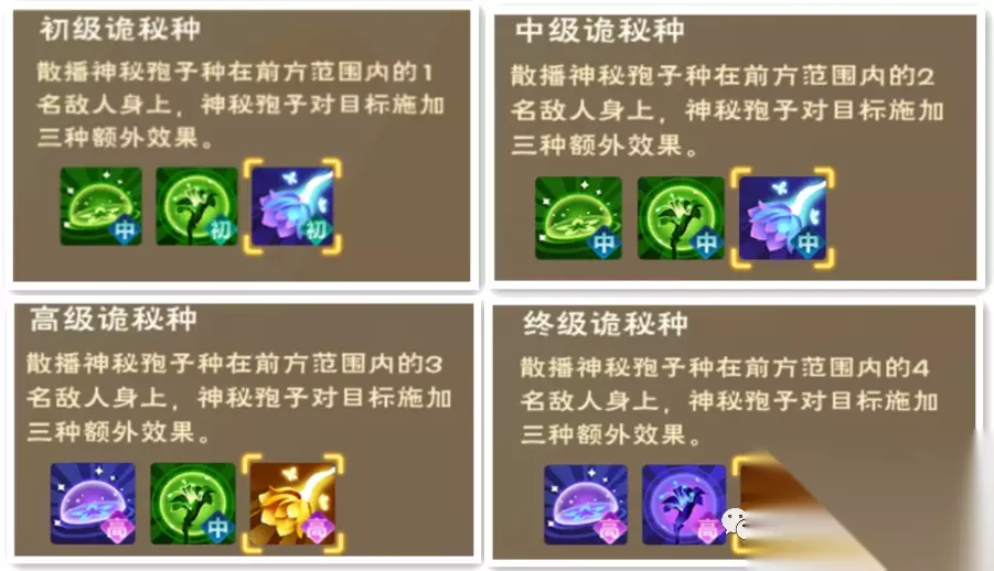 该技能分初、中、高三个等级,效果为菇灵荆怪普通攻击对目标造成0.3/0.4/0.5倍物理伤害,并附加一层剧毒(可叠加4层),每秒造成4/7/11点毒液伤害,持续5s。