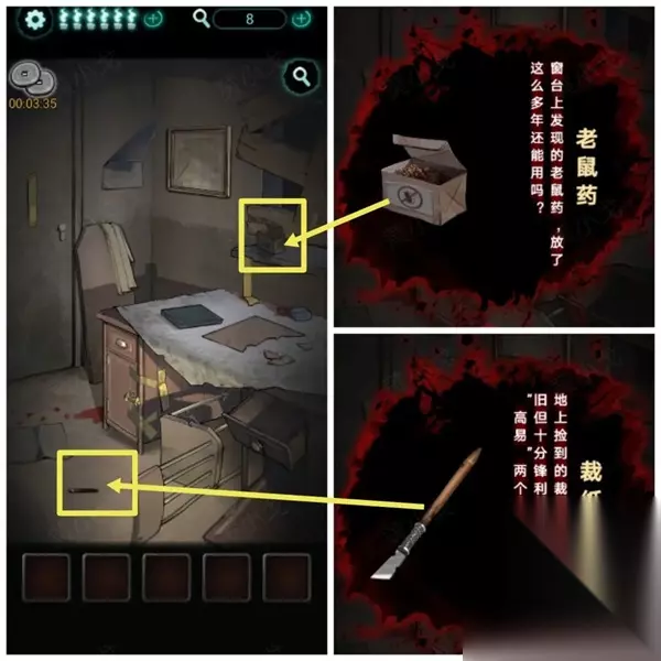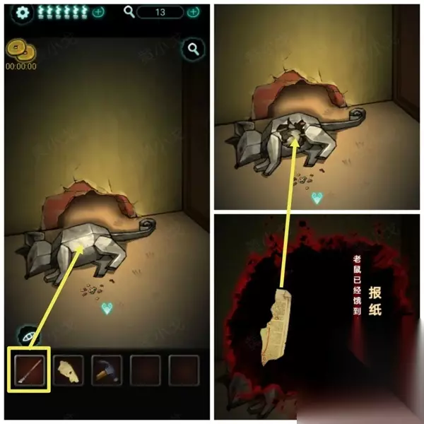 7、柜子旁边有一个老鼠洞,将窗台上获取的老鼠药放进去,老鼠变成纸老鼠。