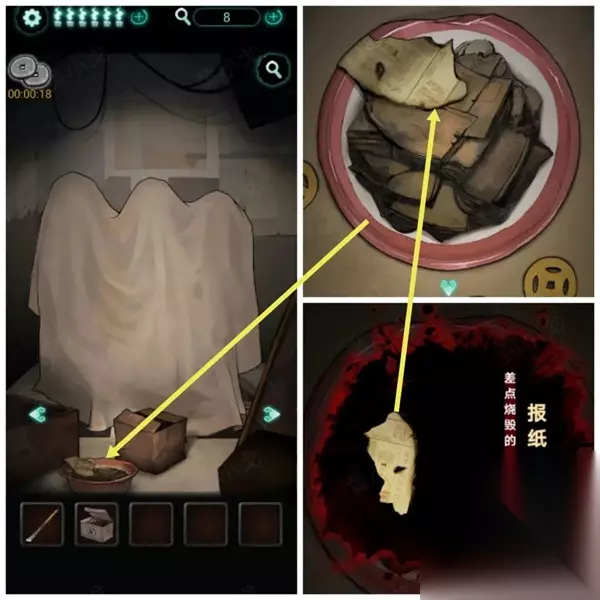 5、老鼠药在窗台上,点击桌子上的笔记本,在旁边的火盆里面可以得到报纸碎片。
