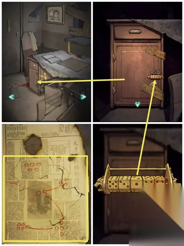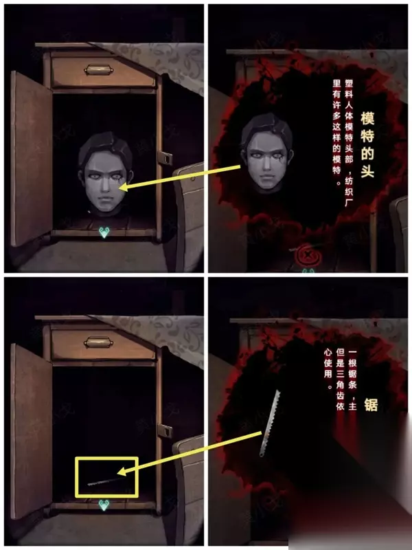 10、得到完整的报纸之后可以触发新的线索,将得到一个53144密码。 11、把这个密码输入到柜子上的密码锁,在里面可以得到模特的头、锯子。