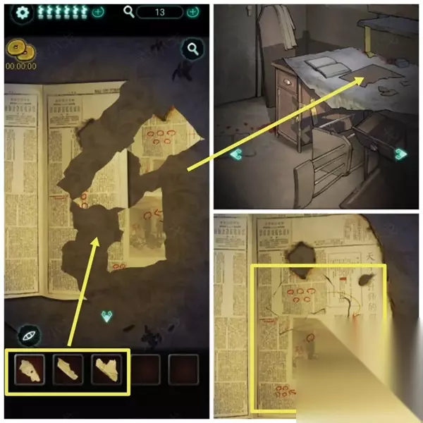 9、将锤子拖到照片上,里面也有报纸碎片,将收集的三个报纸碎片放在桌子上的报纸上。