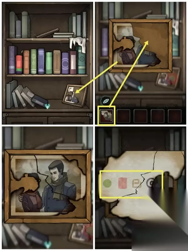 17、将残破的相片放到相框里面,在照片的鸿门可以得到绿、红、黄、紫线索。