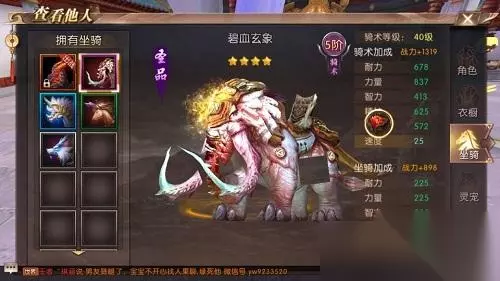 神品:五首万尊龙、如意迦楼罗、幻羽梵灵鹫、昭天暗龙王、北冥圣玄武、踏月逐日龙、流云飞霞兽。 尊品:龙凤锦鲤、青花居蟹、逢泰冰虎、擎天神龙、绝地毒龙、炼血烈兽、霜华灵圣象、通天灵犀。 品级越高属性越高,移动速度也越高,最难获得的是神品,我们一般用的是尊品和极品,坐骑可以提升移速属性当然坐骑还可以进化,进化来提升坐骑的属性,升级、繁殖、炼化都是可以提升坐骑的属性的,所以我们要提升坐骑的全部属性,坐骑升级到12级就可以繁殖了,杀怪可以快速提升坐骑等级。 以上就是本次具体的攻略分享,希望对玩家们有一定的帮助,请多多支持与关注233乐园哦! 如转载涉及版权等问题,请作者与我司联系,我司将在第一时间删除或支付稿酬。
