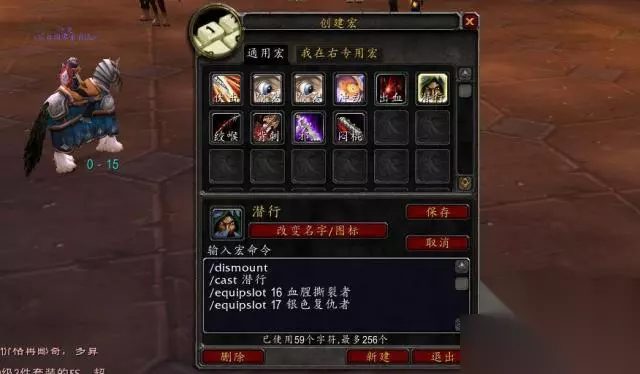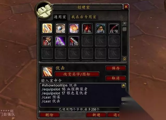 #隐身主手换匕首伏击宏# #showtooltip 潜行 /equipslot 16 匕首名 /equipslot 17 武器名 /cast 潜行 有这么一个宏,在你进入潜行状态之后,它能把你的主手武器换成你想要替换的匕首,这就方便你去打伏击了。匕首的名称呢,你既可以通过按shift+左键的方式获取,也能够自己手动输入。 注:16 是指主手 17是指副手
