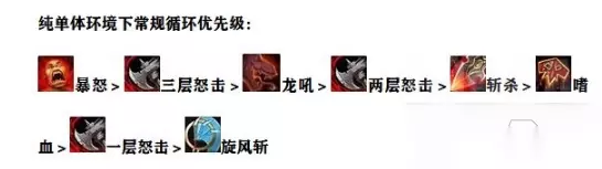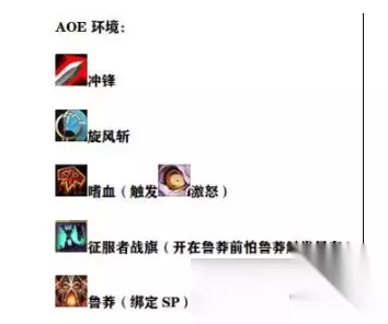 [collapse=单体优先级] AOE环境 AOE环境下,起手冲锋,冲锋路上刮出旋风斩,贴怪后打嗜血触发激怒,这里先开战旗再开鲁莽是怕鲁莽痛苦之王触发了风车,这样第一个风车吃不到战旗的精通和力量是很亏的。起手详见下图: