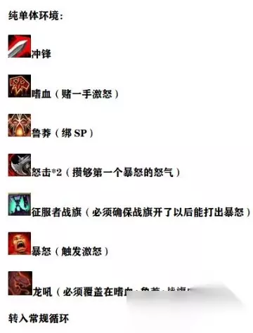 由于套装和双橙的加入,我们的输出循环有了一点小小的变动,但总体大纲还在,更多是一些细节问题的处理,老规矩,先从爆发手法开始讲。 纯单体环境 纯单体环境下,起手冲锋贴怪,打出第一个嗜血,触发了激怒就赚,不触发也不亏,然后立马开鲁莽+SP,打一到两个怒击就能攒够80点怒气,这时候开征服者战旗正式开启爆发,把刚刚攒好的暴怒打出去触发激怒,此时在鲁莽+战旗+激怒+SP的最强爆发内打出可三倍暴击的龙吼,之后转入常规循环。起手循环详见下图: