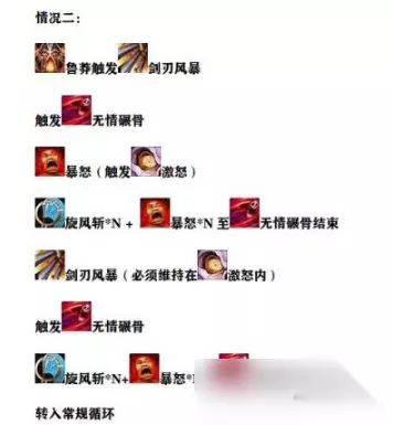 情况二:如果鲁莽触发的是剑刃风暴,就等大风车结束触发无情碾骨,此时激怒快没了,马上补一发暴怒再开始刮旋风斩,激怒快没了就补一发暴怒,刮到无情碾骨结束。此时开启手动大风车,然后继续反复横跳旋风斩和暴怒直到打完所有的无情碾骨BUFF,转入常规循环。具体详见下图: −情况二手法 ...