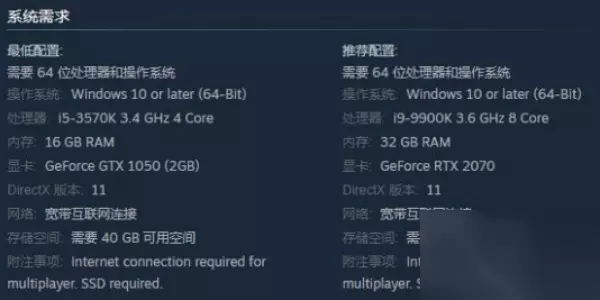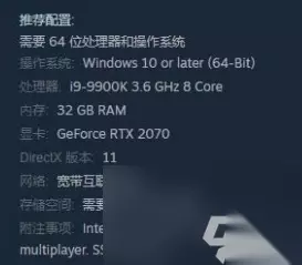二、推荐配置要求 操作系统:Windows 10 或更新版本 (64-Bit) 处理器:i9-9900K 3.6 GHz 8核 内存:32 GB RAM 显卡:GeForce RTX 2070 DirectX版本:Version 11 硬盘空间:40 GB(SSD固态硬盘)