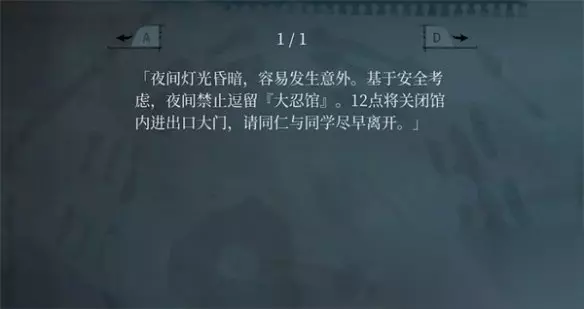 等保安走了之后,就可以在停车场里发现文华大学的海报和静止夜间逗留大忍馆的通知,不过主角的任务就是进入这里。
