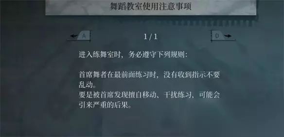 这芭蕾舞训练室有一个领舞,在附近的房间能找到舞蹈教室使用规则,然后近距离观察领舞。