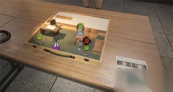 开始要布置拍摄的路线图,先在场地模型上拿到一个女角色纸偶,在商讨的房间内还能拿到电影剧本。