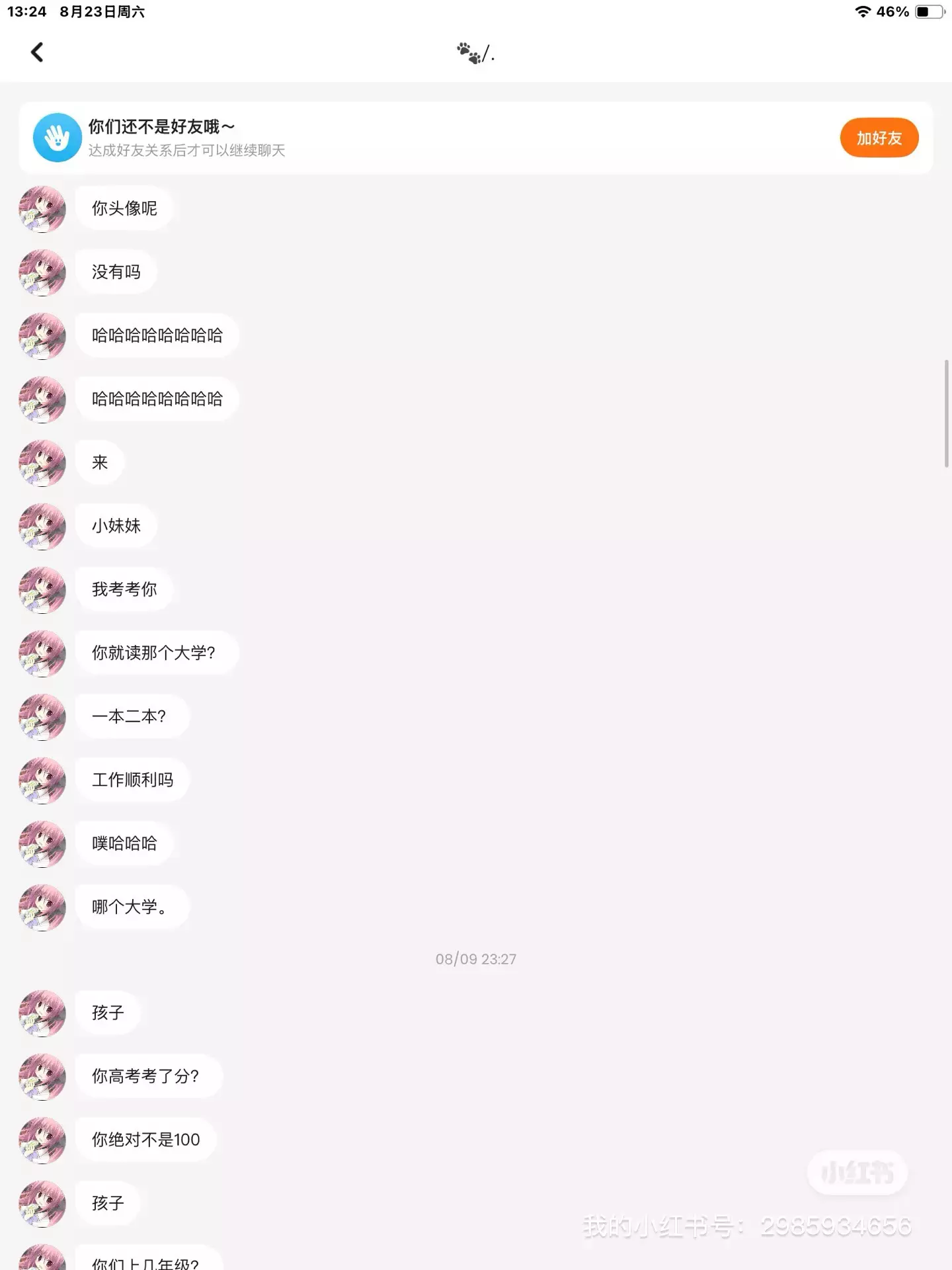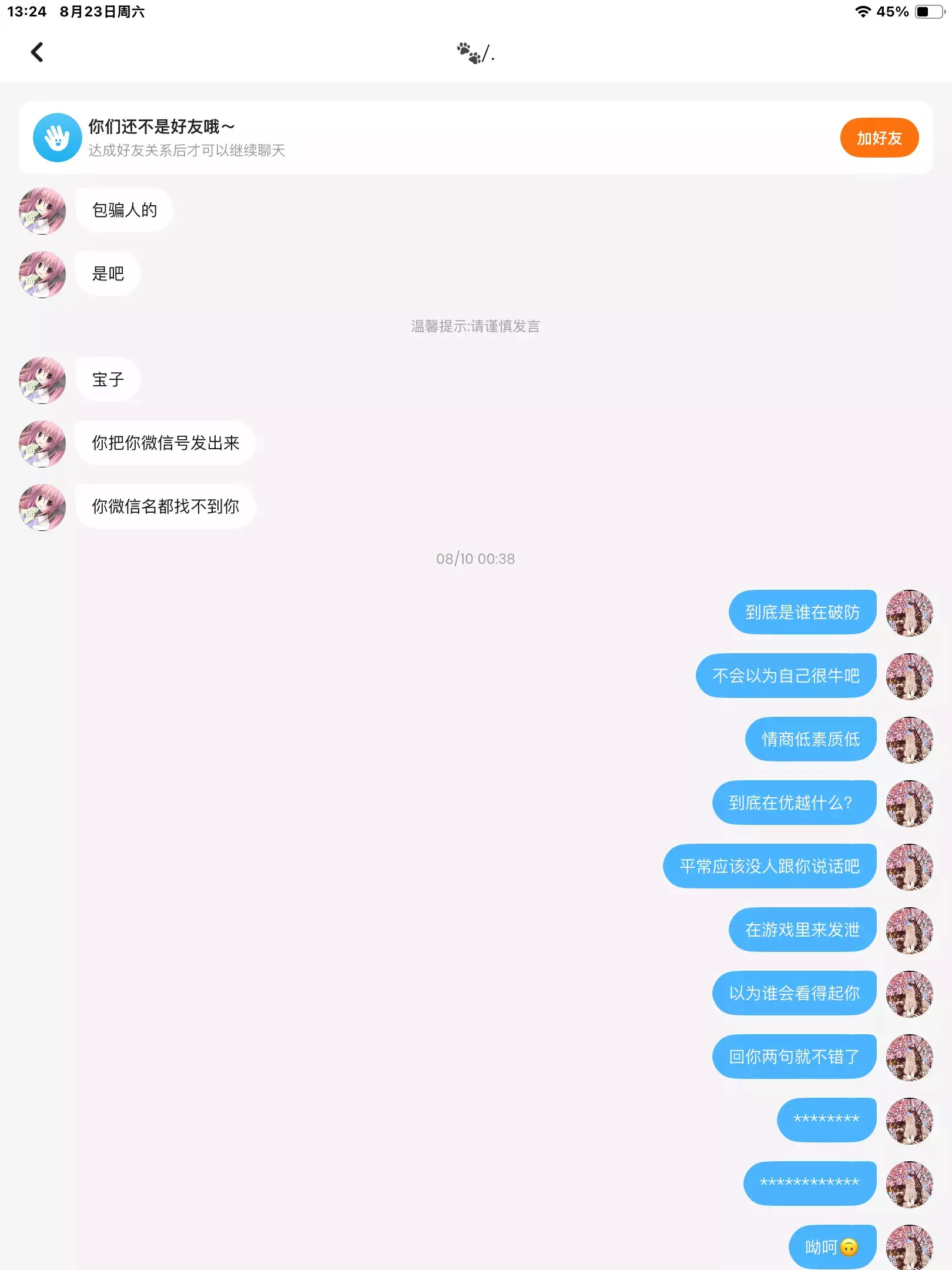先说p1,先是一个人骑着猫再出生点乱撞,撞到我了,我想着撞回去,然后她就突然闪了出来,我也来不及反应,就直接撞到了她(并没有她帖子中的一直打,况且我一开始就跟她说过,发帖的时候是忘了还是脑容量太小???)她就开始给我发信息,语气很不好(由于我是在游戏里给她回复,所以大部分我的消息是没有的)我就跟她解释,并没有在这时候骂她!! P2~P6她问了我很多问题,(包括年龄,职业,高考分数和对我的辱骂,猜忌),我大部分都是在反驳,一些单词问题我如实回复 其次,我用的确实是26健(真就不知道这也能嘲笑了,心眼也是够小了),也不是你口中所说的小学生(你自己才上五年级,搁这装什么装?发帖到底是在骂谁呀?脸都不要了是吗宝🫠) 再来说我后面一小部分的确没有回,因为她实在太烦了(且回了她不信,不回她就认为我没有or不知道)整篇帖子掐头去尾,真不知道在优越什么,到底谁是小学生自己心里最好清楚,把我拉黑了再发帖子是在怕啥呀?20“多”这个字是看不到(毕竟心眼小)吗,皮下藏着啥呀囧3🤨 #樱校联机