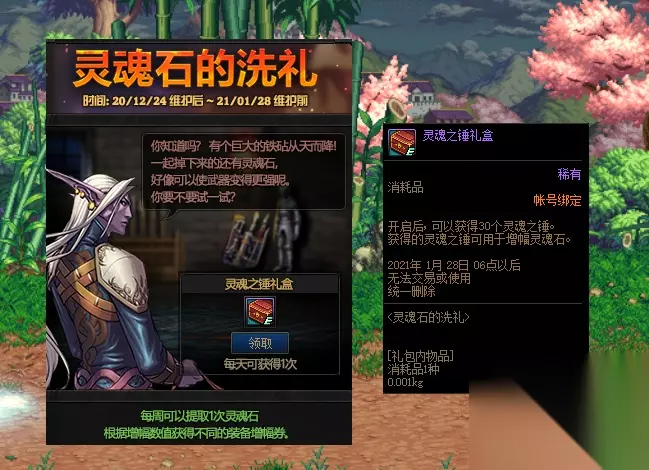 游戏道具奖励具体如下: 传说勋章自选礼盒:可以给需要的小号,奶系职业等携带,也可以给自己大号留作一个强化的底子用。 稀有守护珠神秘礼袋:还是小号用的道具。 辅助装备/魔法石/耳环三个特殊装备部位的附魔宝珠,附魔属性中等偏上,传统刮刮乐附魔套路,还是看玩家需求,按需分配即可。 (那么问题来了:怀清,怀柔与怀特是什么关系?) 礼物大派送:免费购物