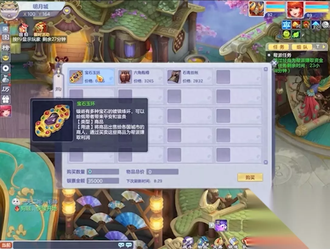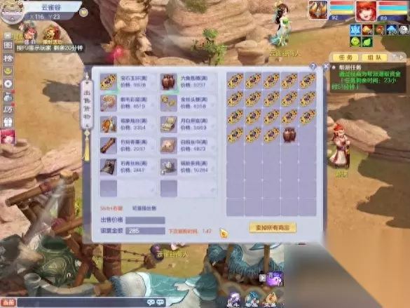 路线方面笔者推荐少侠们选择明月城与云雀谷,以宝石玉环为例,我们在明月城买到商品之后就要一路快马加鞭来到云雀谷出货。因为跑商物品的价格会每10分钟刷新一次,所以我们要尽可能在10分钟内跑完一轮,否则下次价格变化可能会大大增加我们的跑商时间。当我们完成在云雀谷的出货后,需要再进一批商品去明月城进行销售,之前让少侠们记住的价格信息这时便十分重要。进完货再次一路火花带闪电地来到明月城,并重复低买高卖的过程。