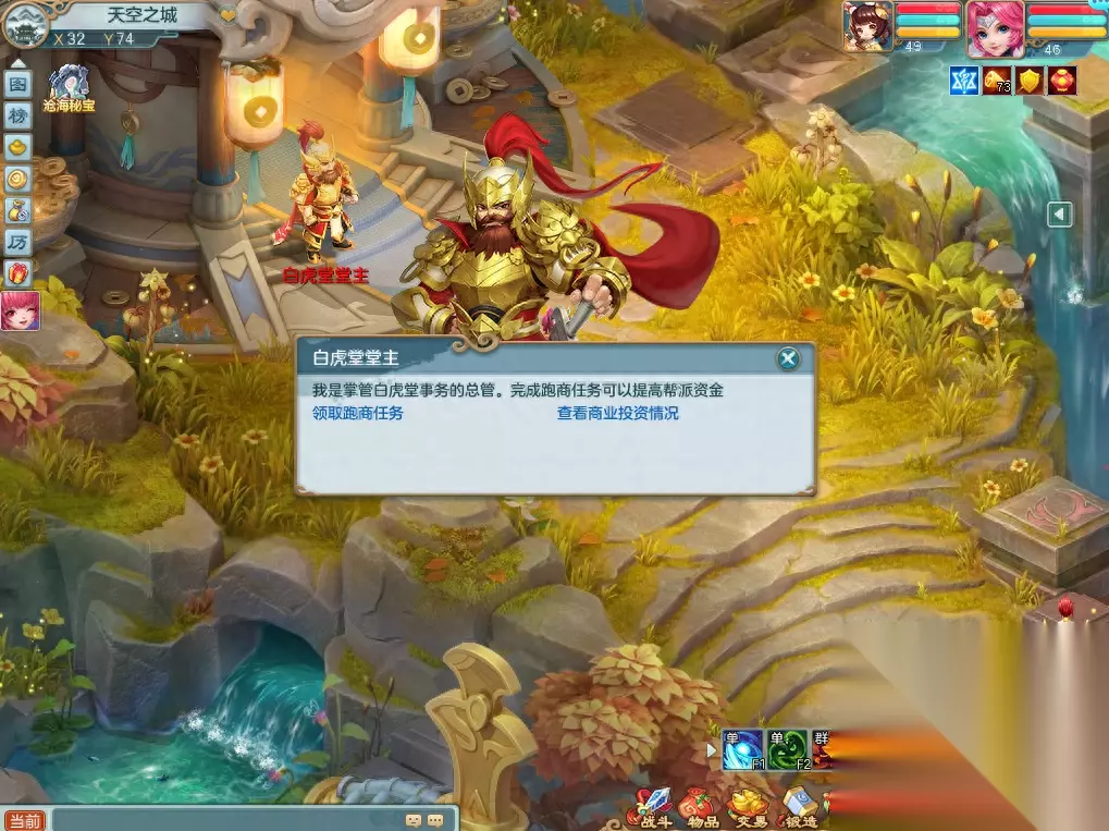 其实所谓跑商,少侠们可以理解为我们平常说的“倒爷儿‘’,跑商过程中我们需要从两个地方将同一件商品进行低买高卖,从而赚取丰厚的差价。首先我们要来到各自的帮派地图,找到帮派地图上的白虎堂堂主,与其对话申请跑商任务。在申请成功后我们就可以开始跑商之旅啦。