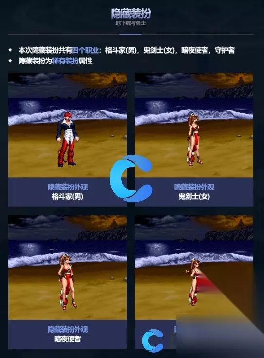 《DNF》2024五一套隐藏装扮介绍 DNF2024五一套角色隐藏装扮 本次隐藏装扮共有四种职业,分别是:格斗家(男)、鬼剑士(女)、暗夜使者、守护者,且这些隐藏装扮均为稀有装扮属性,装扮外观如下图: