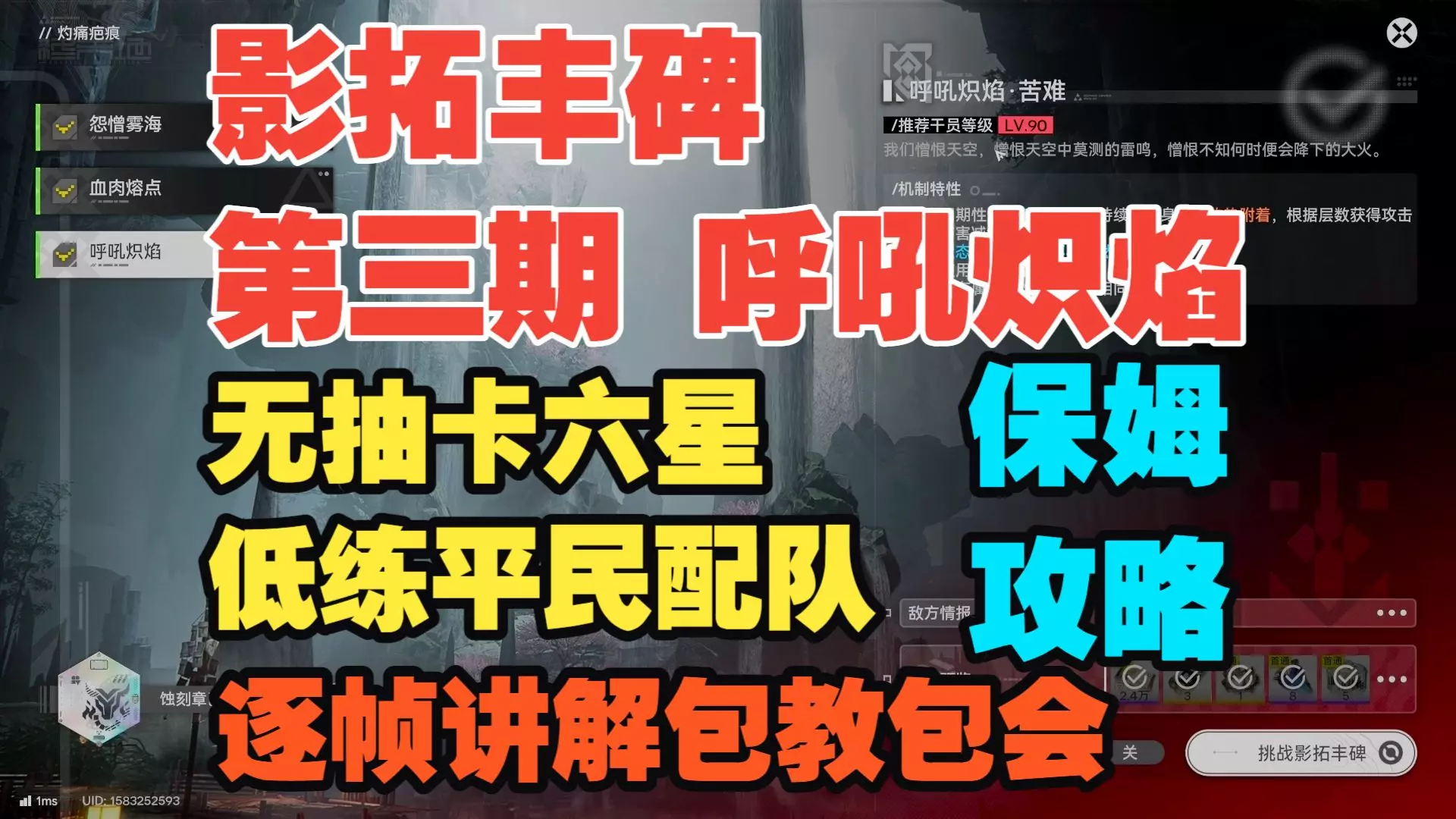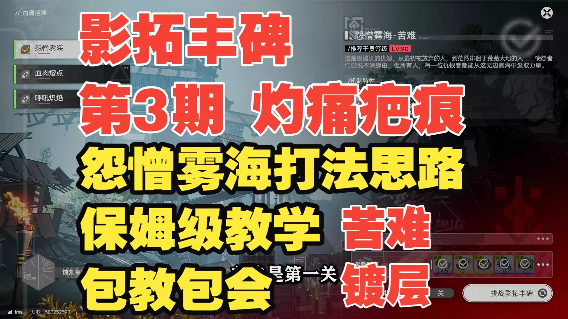 这是《明日方舟:终末地》影拓丰碑·灼痛疤痕的关卡攻略,分享了怨憎雾海、血肉熔点、呼吼炽焰苦难难度的通关阵容,该阵容无需轴,简单好抄,选对阵容就能轻松通关。