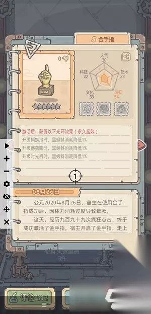 金手指属性 人气:30 科技:22 文化:33 信仰:54 艺术:23 激活后,获得以下光环效果(永久起效) 升级蝌蚪池时,黑蝌蚪消耗降低1%; 升级蘑菇园时,黑蝌蚪消耗降低1%; 升级时光机时,黑蝌蚪消耗降低1%。