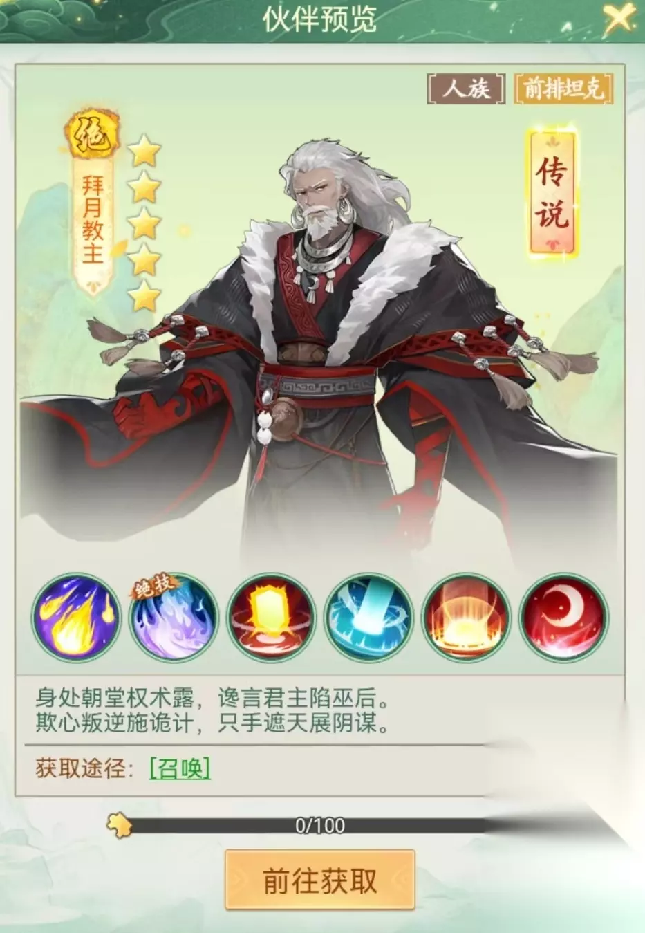 目前神魔之井中拜月教主就是最佳选择,也是众多玩家的终极目标。拜月教主不仅是传说角色,更是不可缺少的前排坦克。绝技万象真火,在造成极高单体伤害的同时,还能大幅提高自身减伤。还有永久物理防御和仙术防御的被动护体,首次出手前给己方全体增加护盾,抵消一定伤害的先手技能,这样不仅自己非常硬,也能够保护团队。
