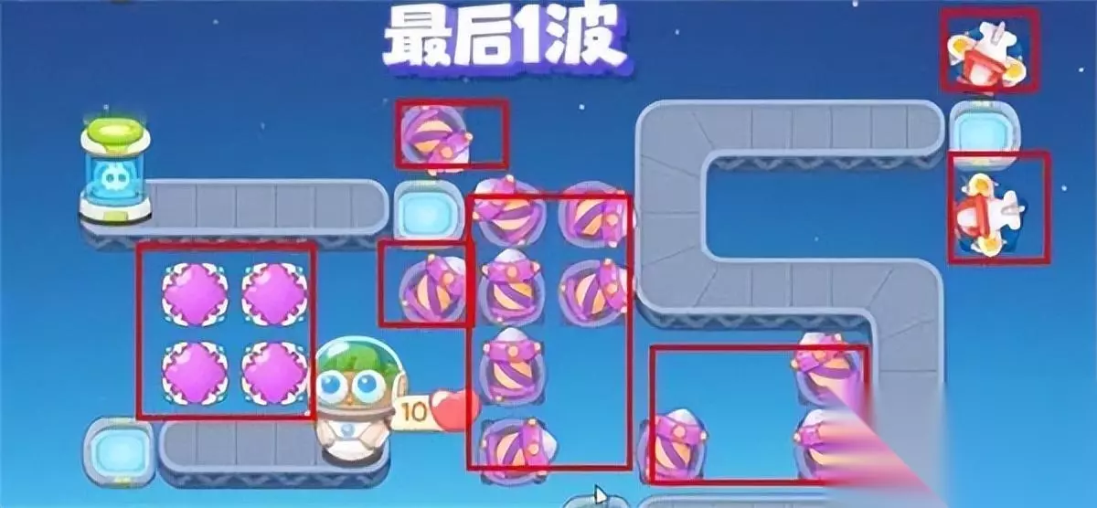3:我们最后要小心的是绳子兔子。这个级别有很多。 4:然后最后的攻击道具就按照下图中的图来摆放,只能多不能少,最好按照小编的方式来摆放,这样通关的几率就大了相对较高。