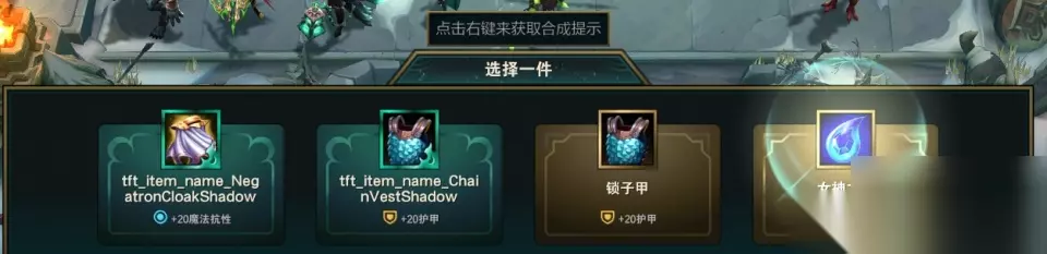 如前所述,选秀环节在后续比赛中被取消,但实际上被类似多选的这种装备兵工厂比赛所取代。玩家在后续会多次遇到这个界面。玩家需要在这里选择一件装备。右键点击这些装备可以看到装备的合成路线,其中带有这个祥云框架的装备是第五季新增的黑暗装备。