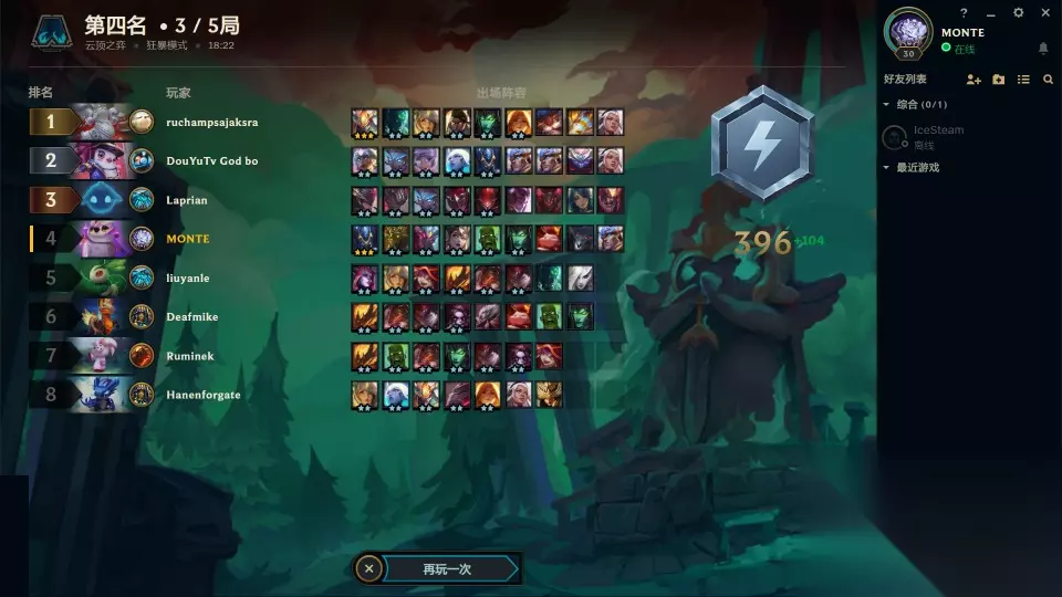 这里的野段是独立的计算系统,不同于云顶游戏的普通模式。一局下来,系统会根据你的阵容和刷新技巧给分。一开始大家都是灰色,然后是绿色,蓝色,最后是紫色,最后达到最高的野段。比如接下来的比赛,第四名刚进了一波坏分。