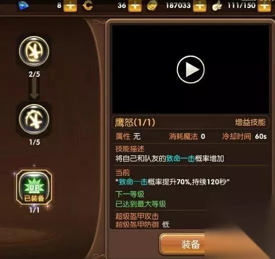 箭神是超远程高输出职业,爆发伤害和持续伤害都可观,输出位置安全 优点: 输出高,打击感强,输出距离远,天生敏捷,非常适合平民玩家。 缺点: 讲究操作和走位。只有高操作才能打出高输出 技能介绍 BUFF技能: 1、鹰怒全员加70%致命一击