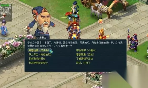 4、队长额外可获得转盘奖励,随机抽取额外物品。 5、任务不受双倍、精修时间影响,死亡计算为非正常死亡,原地复活无损失。 特别说明: 1、任务限时40分钟,可在大唐雅士处取消,但3分钟内不能重新领取。 2、完成任务可获得【清明节积分】,可在4月15日08:00前兑换召唤兽寿命。 二、寒食迷踪 :副本挑战,揭开神秘真相 参与条件:等级≥50级,队伍人数=5人 玩法介绍 1、该活动为副本玩法,任务可在【大唐雅士】处领取。