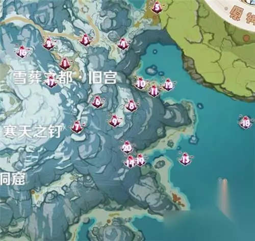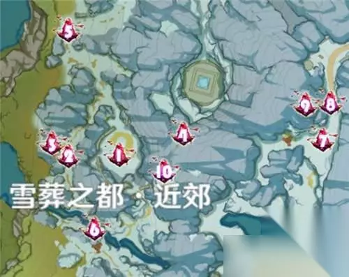 绯红玉髓点位详细解读:1.雪葬之都·近郊上方传送点右下的回路挑战完成以后出现的箱子获得。 2.雪葬之都·近郊葬字上方的小路的空中。 3.雪葬之都·近郊葬字上方的小路。 4.雪葬之都·近郊郊字上方山崖中的小路上。 5.#雪葬之都·近郊葬字正上方的小坡上地板上有些机关(需解密,以及融化冰块!!),请见下文。 6.雪葬之都·近郊都字下方的瀑布下击败丘丘霜铠王以及射手后出现箱子。7.雪葬之都·近郊右上的山路中打败丘丘霜铠王获得箱子内。 8.雪葬之都·近郊右上角山路的高低楼梯空中。 9.雪葬之都·近郊右上高低楼梯旁边的山腰上。 10.雪葬之都·近郊近字上方限时挑战完成后箱子里。 5、星荧洞窟外(14个):