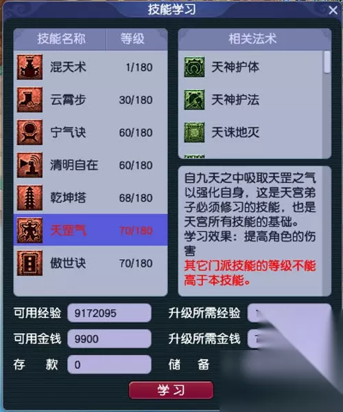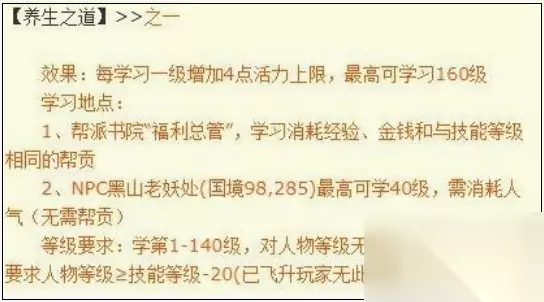 梦幻西游技能养生之道怎么样 学习地点: 1、帮派书院“福利总管”处学习,学习消耗经验、金钱和与技能等级相同的帮贡。 2、NPC黑山老妖处(国境98.285)最高可学40级,消耗人气。 3、等级要求:学第1-140级,对人物等级无要求,第141-160级要求人物等级等于技能等级-20。
