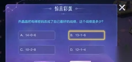 答案:1316 1、13-1-6就是乔晶晶自己最好的战绩。 2、这个题目答案其实可以在《你是我的荣耀》里面找到,所以这个乔晶晶电梯密码就是1316。