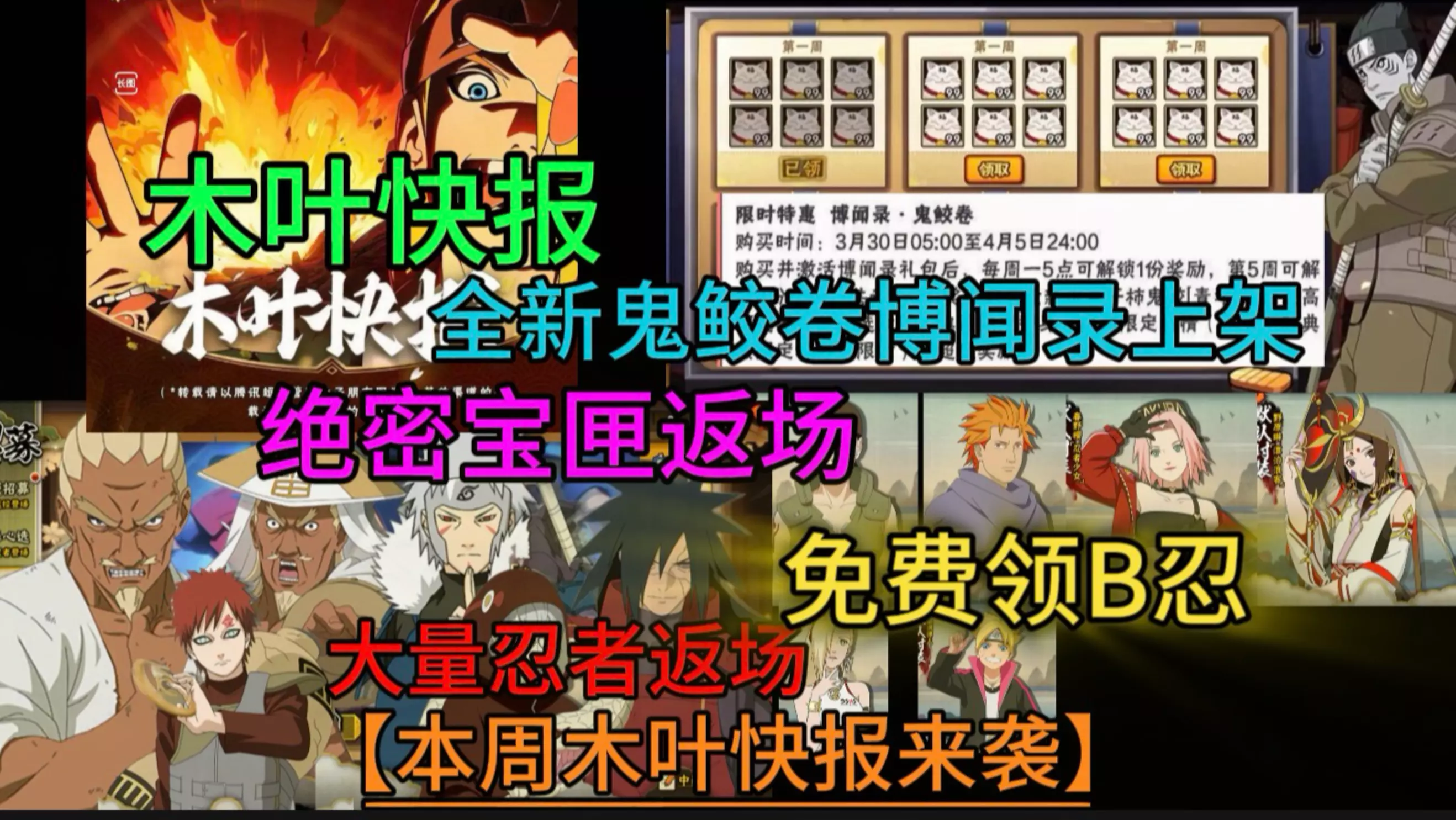 火影忍者手游开启多项活动:绝密宝匣或将常驻,踏春季免费送B忍,博闻录“鬼鲛卷”上线,还有火影版鹅鸭杀“谁是叛忍”玩法,同时12胜、通灵夺宝、木叶观光等活动返场,奈良鹿台限时登场。