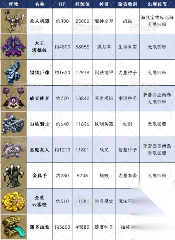 另外,在无限回廊20~25层刷大王海德拉可以高效练级,单只大王海德拉可以获得88055点经验,比金属系怪物还高,其他敌人的经验值也比较可观,因此在此时期想要练级到Lv99的话也可以不必执着于金属系怪物,在回廊20~25层反复战斗即可速刷等级。