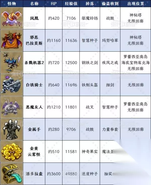 无限回廊中的怪物及掉落 ※无限回廊15和26层没有怪物。 无限回廊1~14层 无限回廊1~14层中的部分怪物会携带驱魔铃铛、战鼓等道具,有需求建议提前准备好偷取,另外潘多拉盒会在宝箱里出现。