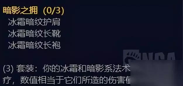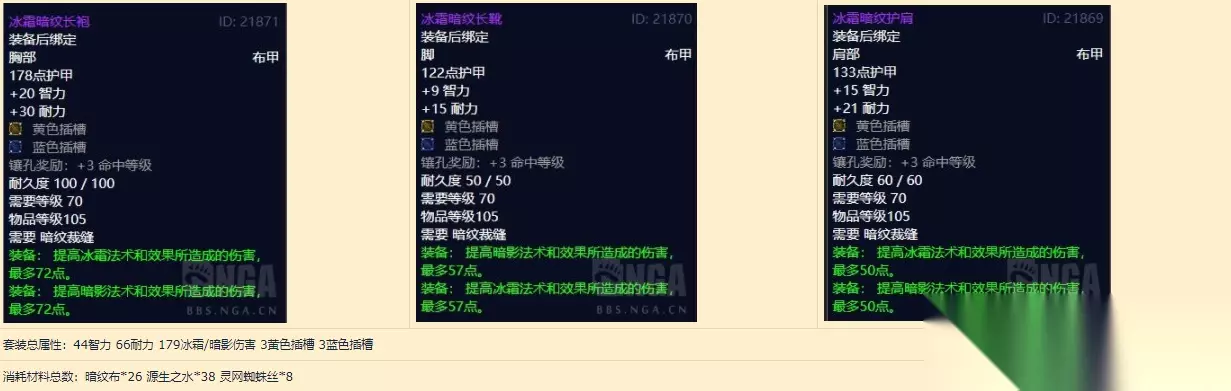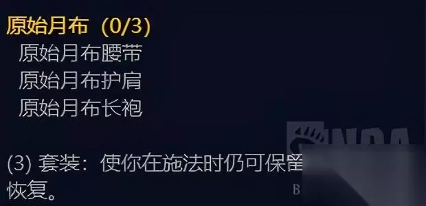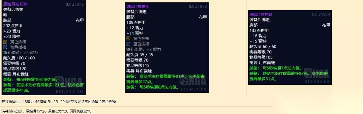 评价: 单件属性都非常出色的套装,无论是冰法、术士、暗牧使用都很合适,套装属性略鸡肋,是P1法系强于近战的立身之本(3+2中的3,在进入团本前就拥有超版本的装备),套装属性随时可以通过换更好的散件舍弃,防止出现仇恨压力。 月布裁缝