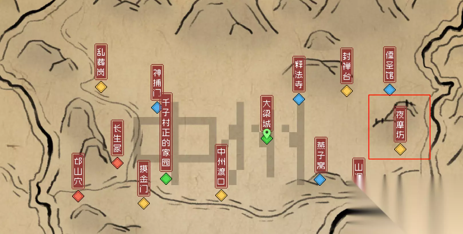 这里说一嘴啊,世界地图上要想解锁地点,需要你自己先去一次,进入过,才会在世界地图上显示。夜摩坊开启的方式。白天去