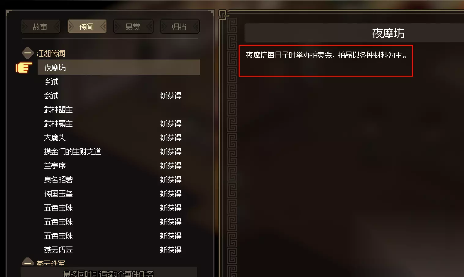 确认自己身上有10贯钱,靠近这边的两个商人就会打听到夜摩坊拍卖会的消息,注意啊,你不打听到夜摩坊拍卖会的消息,你是参加不了拍卖会的。