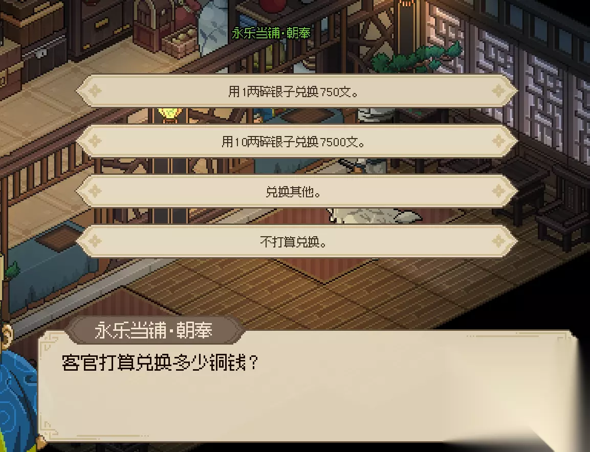 点击兑换,点击用银子换铜钱,换个3贯左右就行了