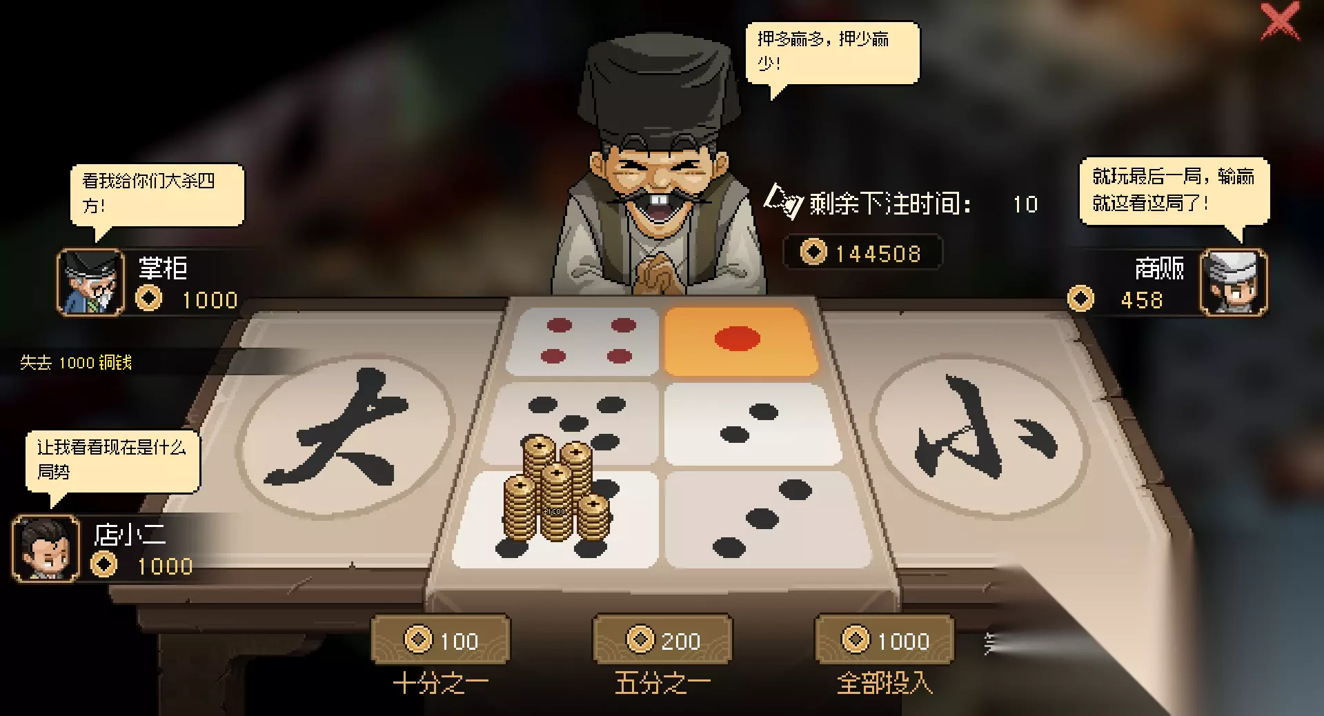 没什么好说的,赌博就是给你用来赚启动资金的,全部赢回来了,他们要花很长的时间攒钱的,我们拿了这赌博的钱还是要去开拍卖行,然后省着点花,还是要去想个赚钱的门路的。但是这赌博前期全赢的话差不多也有个200多贯,足够我们花很长一段时间了。多去花钱买礼物多去送礼,刷我们仁德义气礼节。有个生财之路才是王道