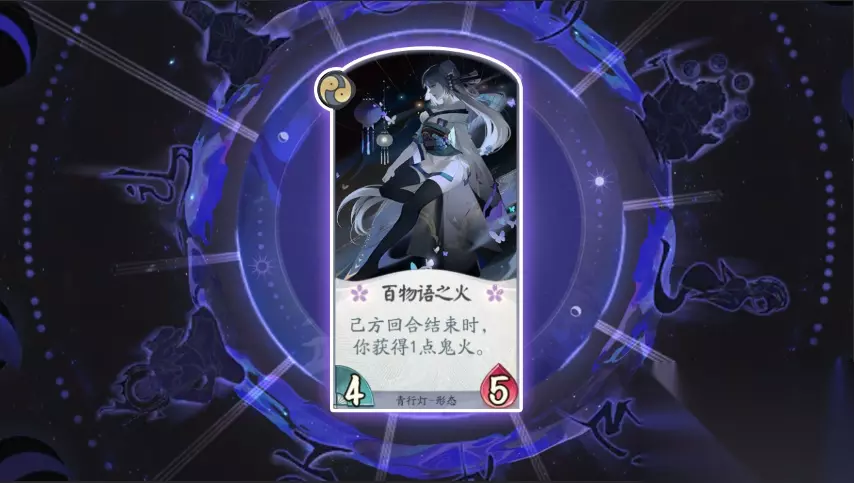 卡牌名称:百物语之火 卡牌等级:二级(形态牌) 卡牌效果:己方回合结束时,你获得1点鬼火。 卡牌作用:使用了“百物语之火”形态后必定会触发基础能力从而获取“明灯”,青行灯的核心卡牌之一,保证触发技能的情况下还能触发手中其他式神的“响应”卡牌。