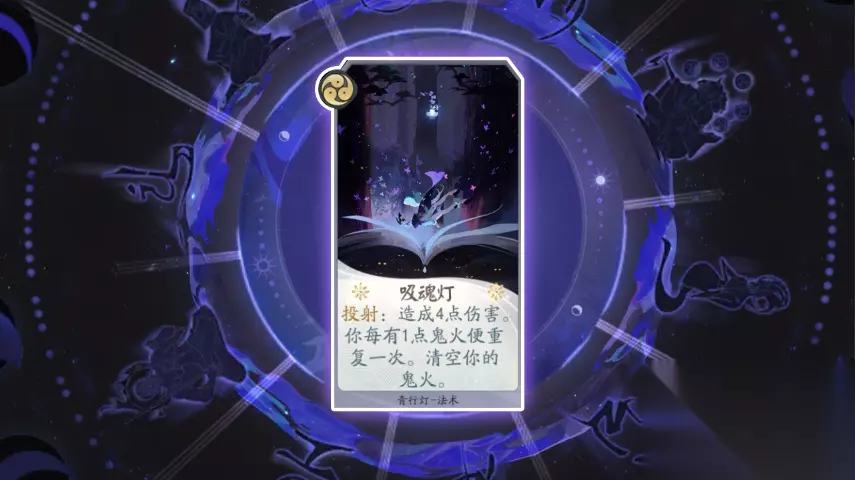 卡牌名称:吸魂灯 卡牌等级:三级(法术牌) 卡牌效果:投射:造成4点伤害。你每有1点鬼火便重复一次。清空你的鬼火。 卡牌作用:唯一的输出法术牌,投射4点伤害,在后期积攒了4点鬼火的情况下最多造成16点伤害,足以解决敌方一些生命较高的式神,因为是多段伤害,比较克制“不屈”效果。