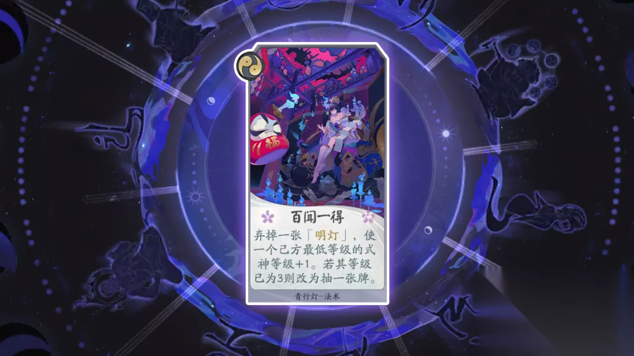 卡牌名称:百闻一得 卡牌等级:二级(法术牌) 卡牌效果:弃掉一张“明灯”,随机使一个己方最低等级的式神等级+1。若等级为3则抽一张牌。 卡牌作用:在前期使用可以快速提升式神等级,代价就是会丢失战斗节奏,让对手先出手。在后期式神等级升满后,对满级式神使用的话,会得到一张用于过牌的卡,不消耗鬼火,抽一张牌。